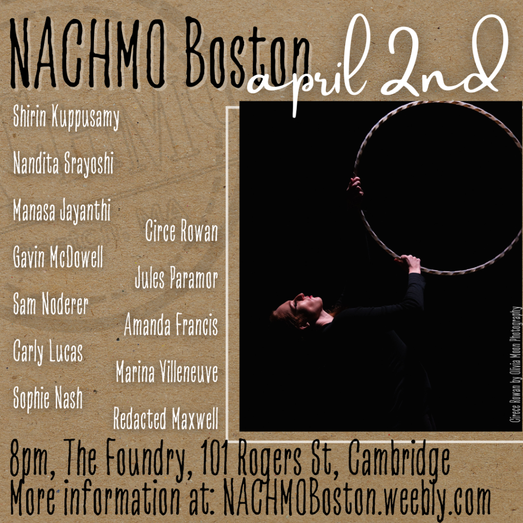 Tickets to NACHMO Boston’s live performances are pay what you can. A suggested donation price is listed, but you can edit to whatever cost makes sense for you. All donations go to providing all NACHMO Boston artists with a FREE NACHMO experience. Your support is greatly appreciated! NACHMO Boston is proud to be fiscally sponsored by Monkeyhouse, making all donations tax deductible. NACHMO Boston shows have been known to sell out. Live performance tickets are limited to 4 per person per night and you will be asked to provide information about each of the attendees to avoid over reserving tickets that aren't needed. Thank you for your understanding.